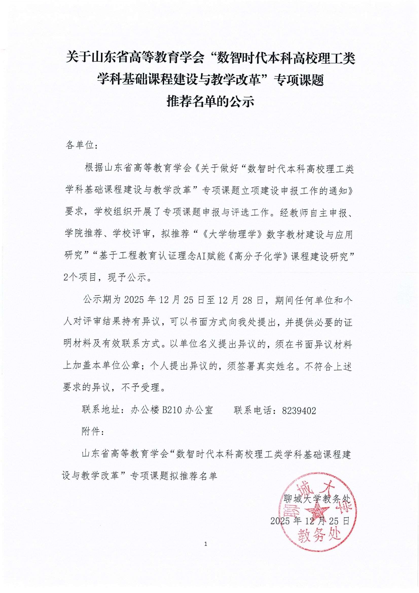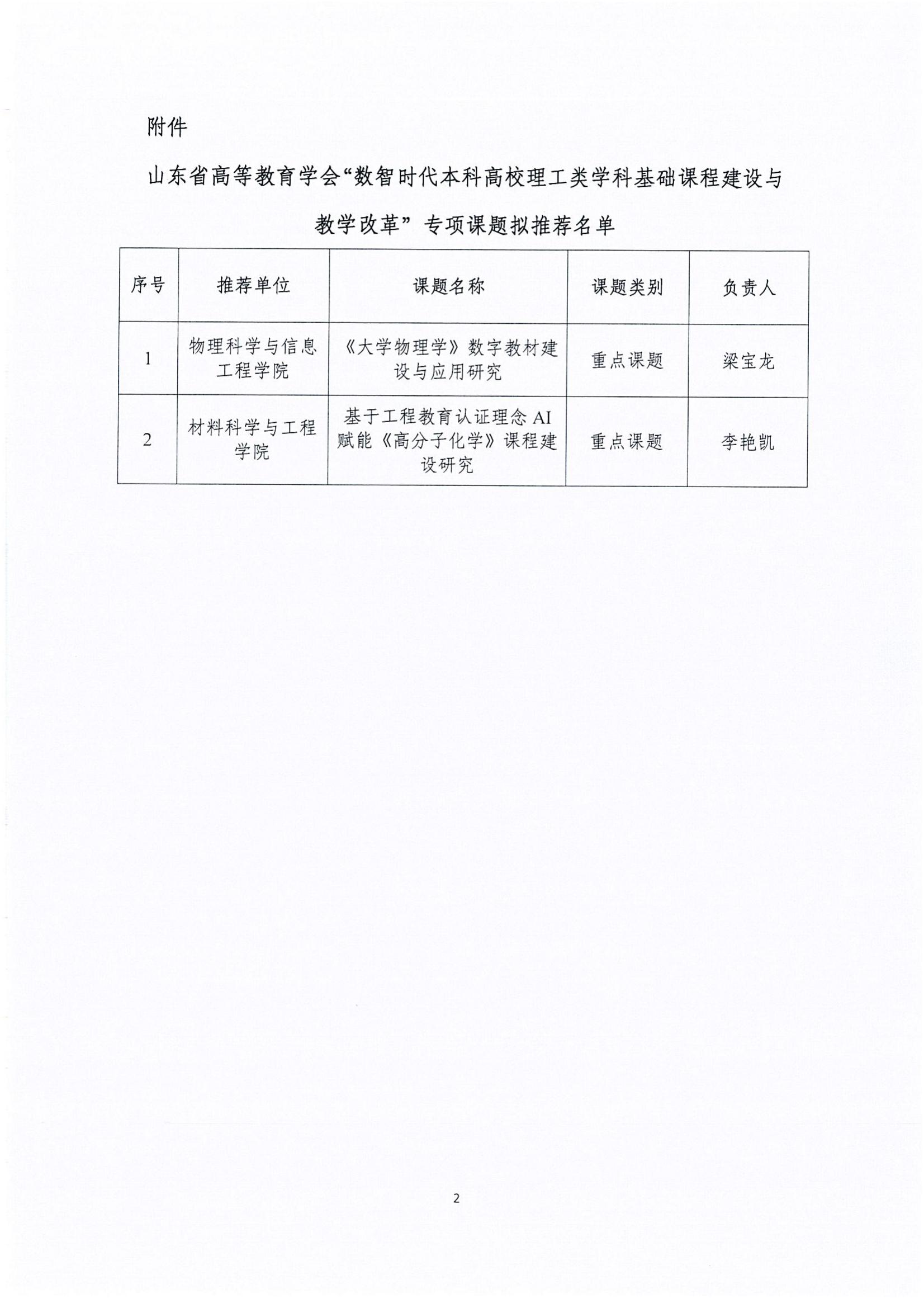 关于山东省高等教育学会“数智时代本科高校理工类学科基础课程建设与教学改革”专项课题 推荐名单的公示
