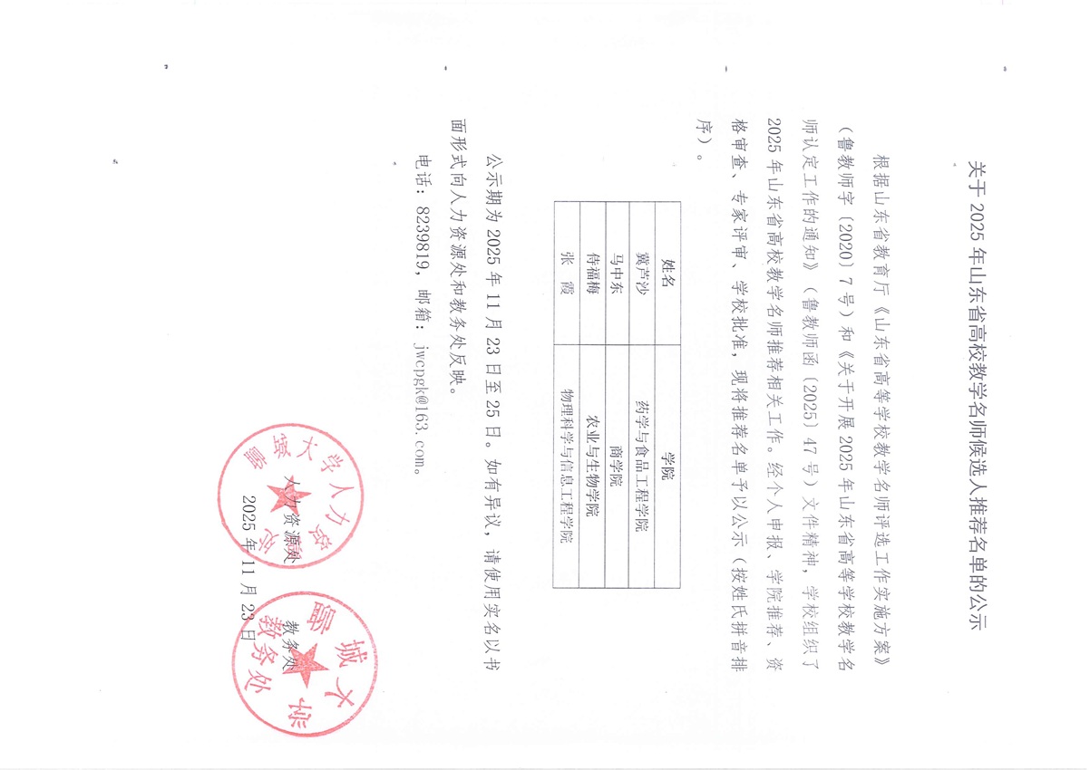 关于2025年山东省高校教学名师候选人推荐名单的公示