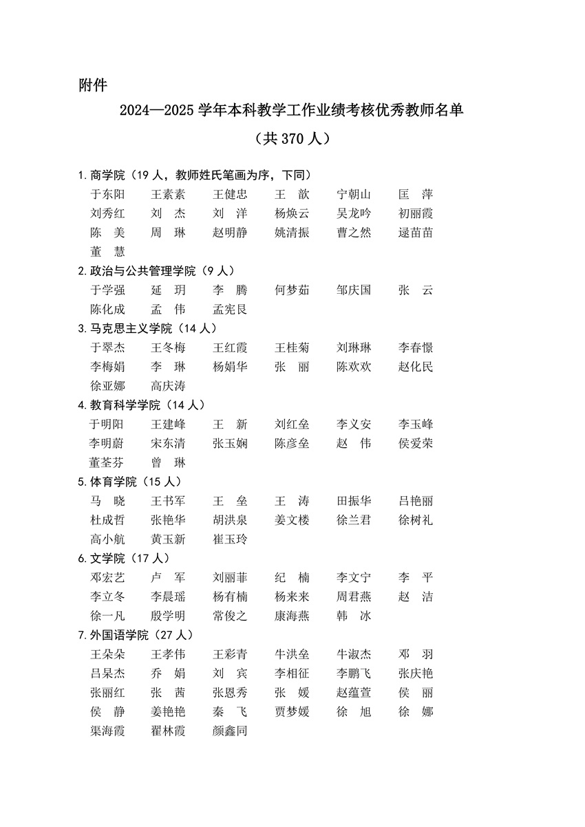 关于公布2024-2025学年本科教学工作业绩考核优秀教师名单
