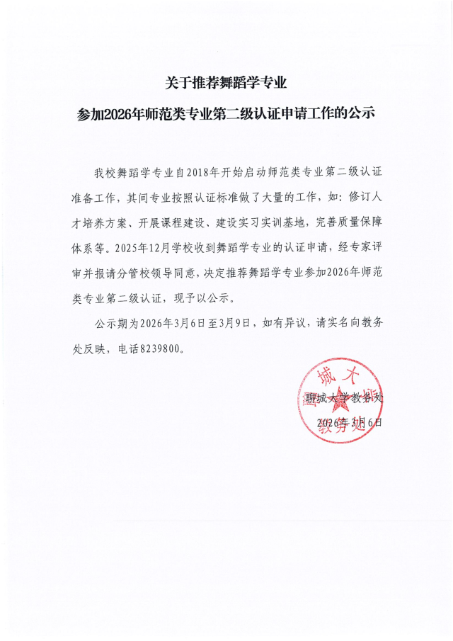 关于推荐舞蹈学专业参加2026年师范类专业第二级认证申请工作的公示