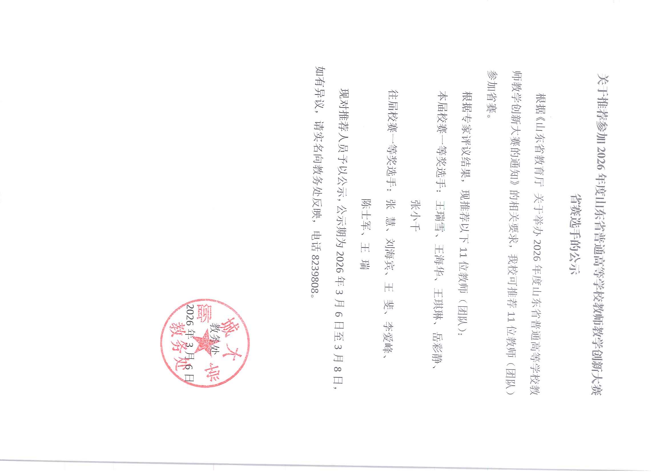 关于推荐参加2026年度山东省普通高等学校教师教学创新大赛省赛选手的公示